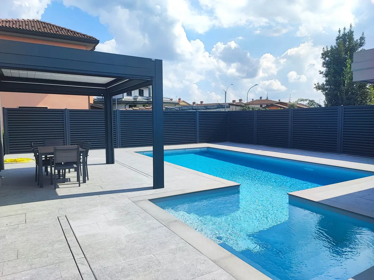 Un ambiente raffinato e funzionale, protetto dal vento (resistenza classe 6) e dagli sguardi esterni. L’abbinamento tra pergola e recinzione coniuga comfort, estetica e privacy in modo coerente con il contesto architettonico.