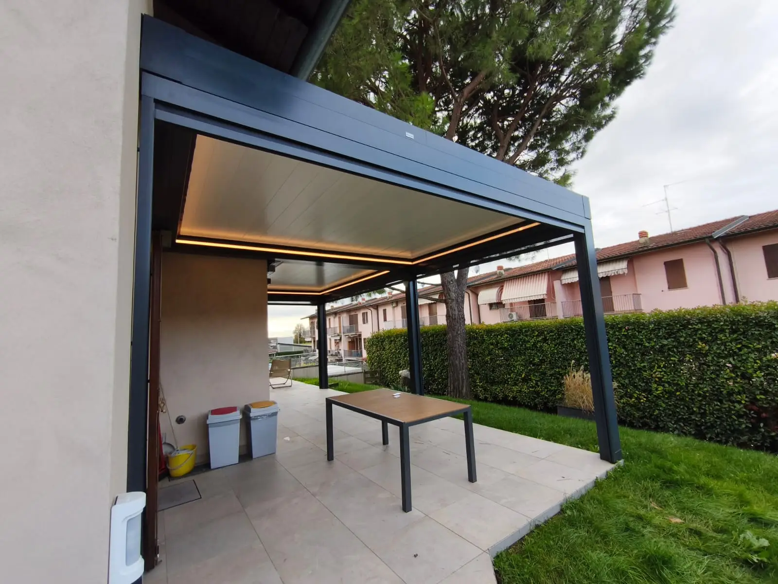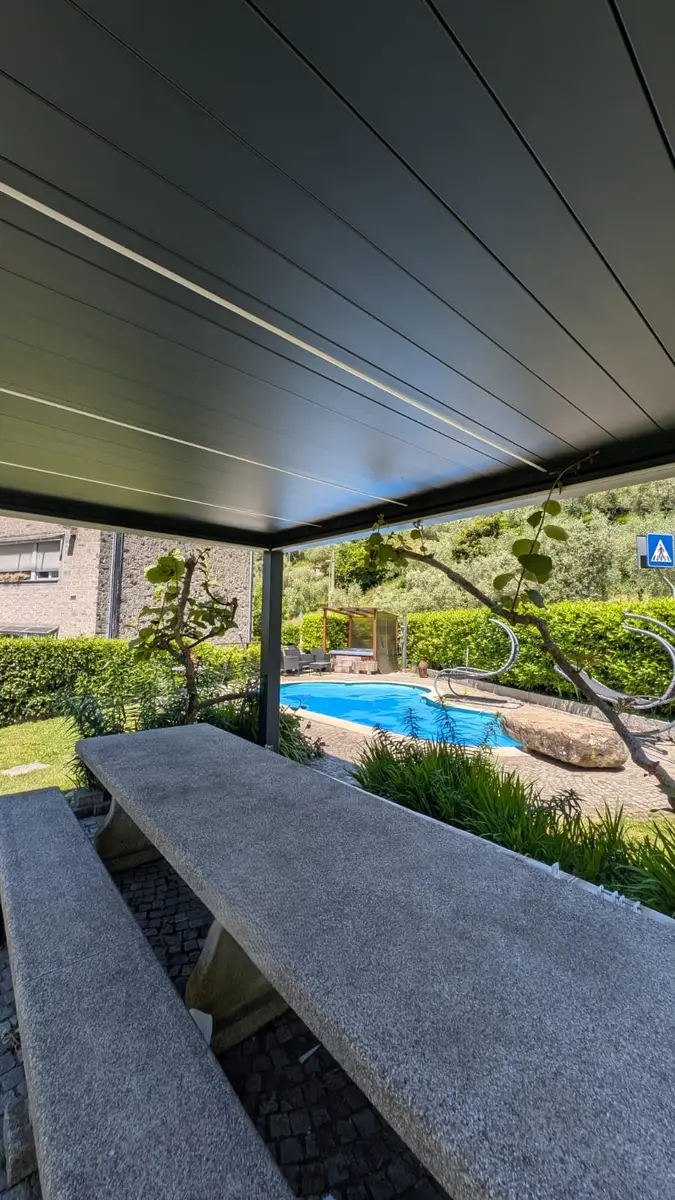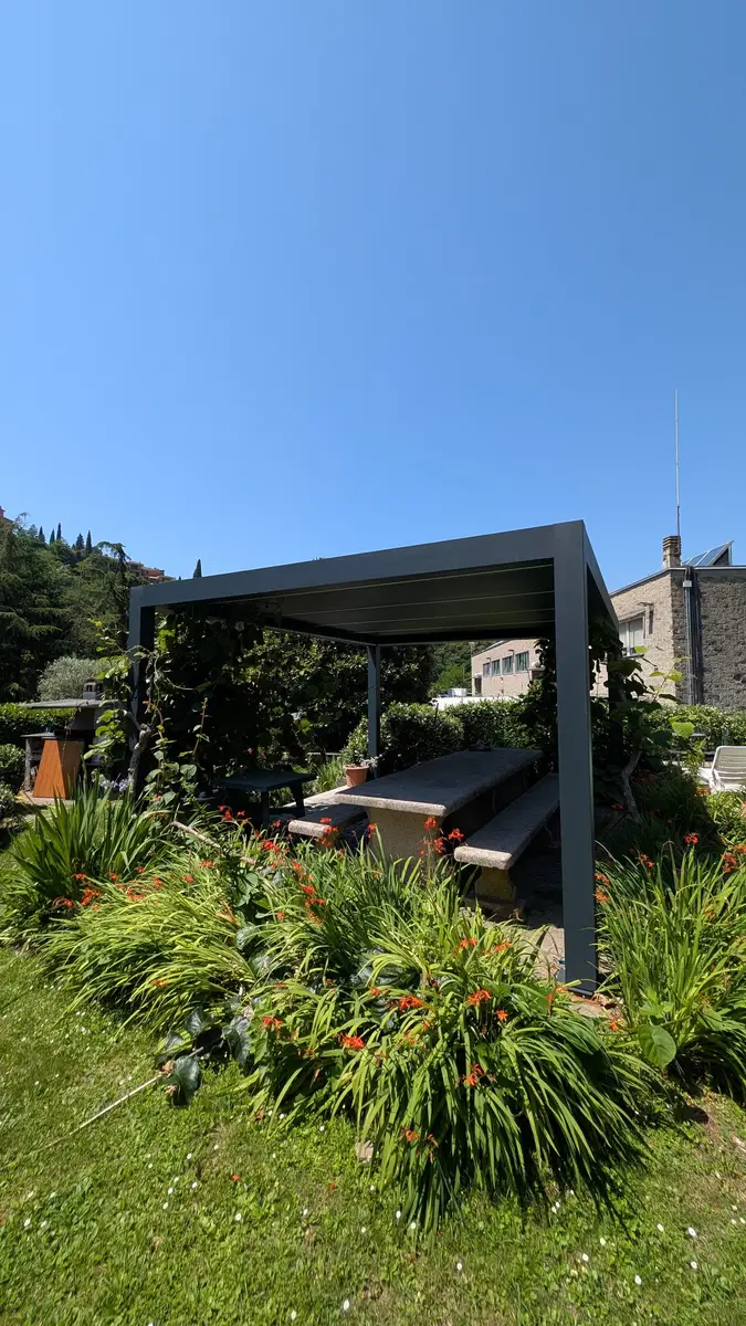 Installazione del modello Elite in alluminio con lamelle orientabili motorizzate, illuminazione LED calda sulle lame e lungo il perimetro. L’intervento ha preservato il fascino naturale dello spazio, offrendo al contempo maggiore comfort e resistenza nel tempo.