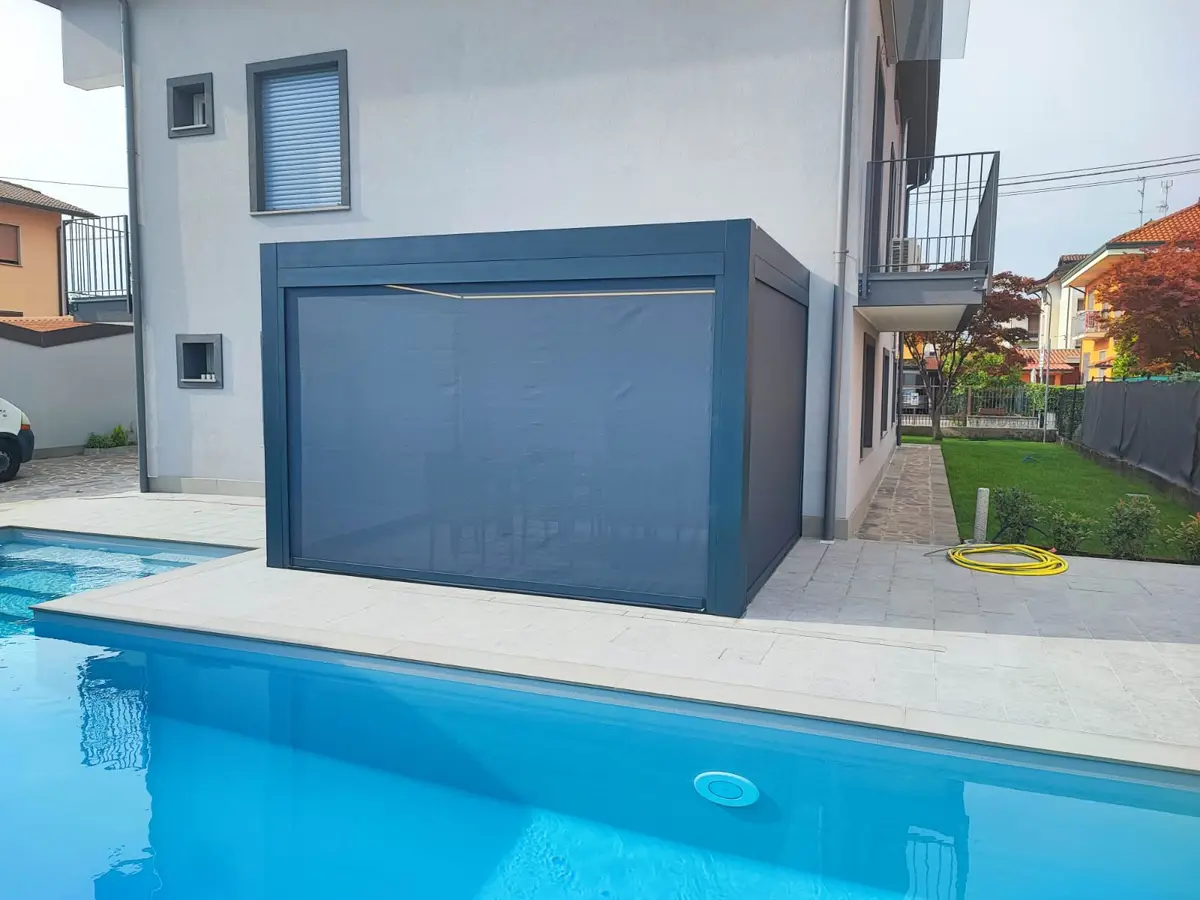 Progettazione su misura del modello Elite, con struttura in alluminio antracite e lamelle bianche orientabili. L’intero perimetro è stato chiuso da vetrate scorrevoli, per vivere la pergola anche d’inverno, e integrato con tende verticali oscuranti per la privacy. Le prime quattro lame fisse risolvono un vincolo strutturale mantenendo continuità estetica.